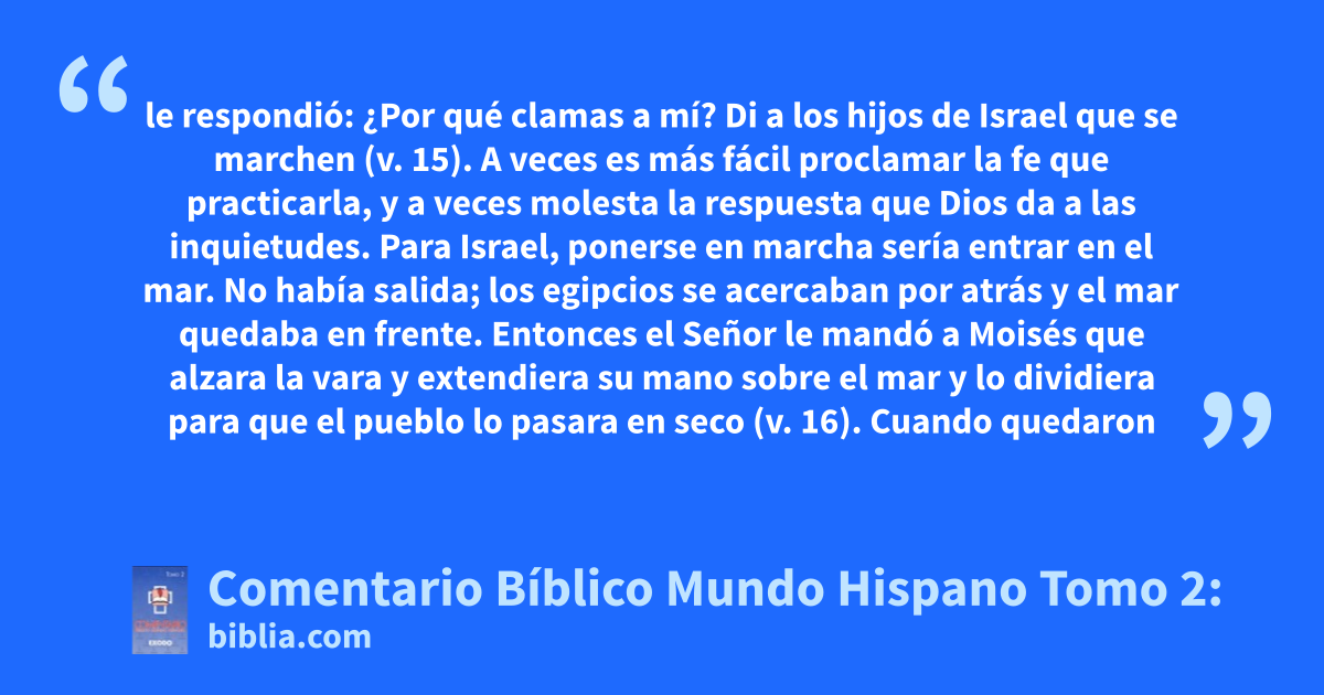 le respondió: ¿Por qué clamas a mí? Di a los hijos de Israel que se marchen (v. 15). A veces es más fácil proclamar la fe que practicarla, y a veces molesta la respuesta que Dios da a las inquietudes. Para Israel, ponerse en marcha sería entrar en el mar. No había salida; los egipcios se acercaban por atrás y el mar quedaba en frente. Entonces el Señor le mandó a Moisés que alzara la vara y extendiera su mano sobre el mar y lo dividiera para que el pueblo lo pasara en seco (v. 16). Cuando quedaron