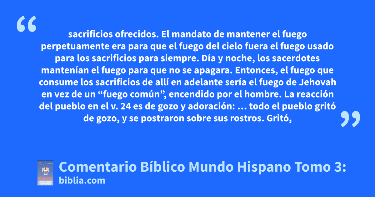 sacrificios ofrecidos. El mandato de mantener el fuego perpetuamente era para que el fuego del cielo fuera el fuego usado para los sacrificios para siempre. Día y noche, los sacerdotes mantenían el fuego para que no se apagara. Entonces, el fuego que consume los sacrificios de allí en adelante sería el fuego de Jehovah en vez de un “fuego común”, encendido por el hombre. La reacción del pueblo en el v. 24 es de gozo y adoración: … todo el pueblo gritó de gozo, y se postraron sobre sus rostros. Gritó,