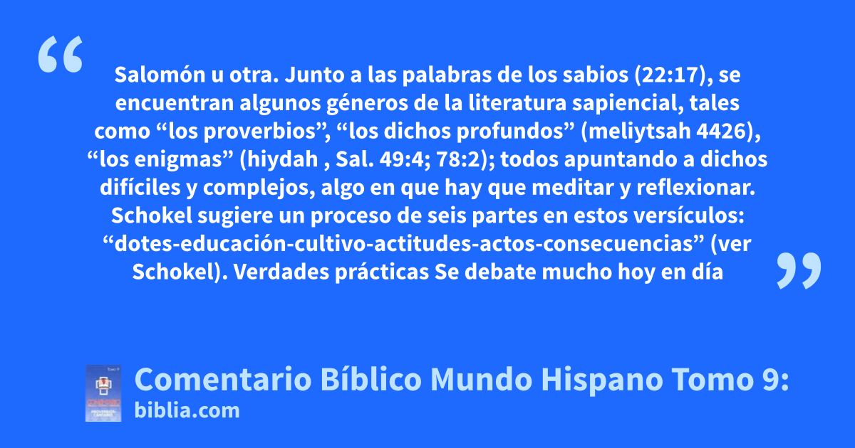 Salomón u otra. Junto a las palabras de los sabios (22:17), se encuentran algunos géneros de la literatura sapiencial, tales como “los proverbios”, “los dichos profundos” (meliytsah 4426), “los enigmas” (hiydah , Sal. 49:4; 78:2); todos apuntando a dichos difíciles y complejos, algo en que hay que meditar y reflexionar. Schokel sugiere un proceso de seis partes en estos versículos: “dotes-educación-cultivo-actitudes-actos-consecuencias” (ver Schokel). Verdades prácticas Se debate mucho hoy en día