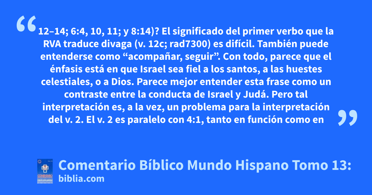 12–14; 6:4, 10, 11; y 8:14)? El significado del primer verbo que la RVA traduce divaga (v. 12c; rad7300) es difícil. También puede entenderse como “acompañar, seguir”. Con todo, parece que el énfasis está en que Israel sea fiel a los santos, a las huestes celestiales, o a Dios. Parece mejor entender esta frase como un contraste entre la conducta de Israel y Judá. Pero tal interpretación es, a la vez, un problema para la interpretación del v. 2. El v. 2 es paralelo con 4:1, tanto en función como en