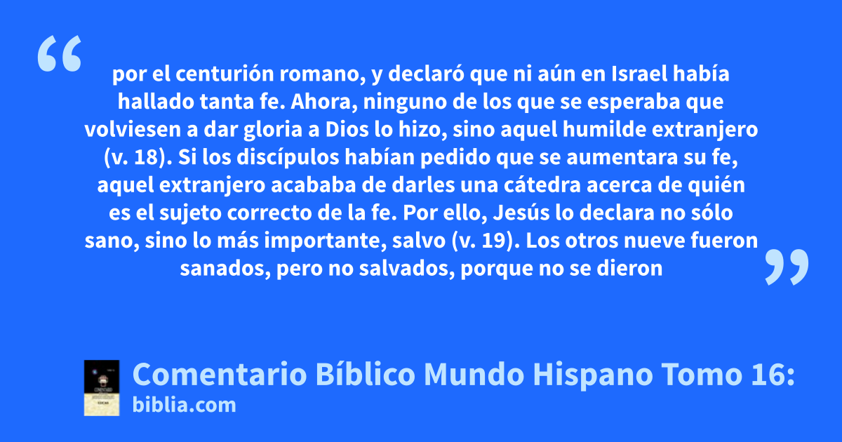 por el centurión romano, y declaró que ni aún en Israel había hallado tanta fe. Ahora, ninguno de los que se esperaba que volviesen a dar gloria a Dios lo hizo, sino aquel humilde extranjero (v. 18). Si los discípulos habían pedido que se aumentara su fe, aquel extranjero acababa de darles una cátedra acerca de quién es el sujeto correcto de la fe. Por ello, Jesús lo declara no sólo sano, sino lo más importante, salvo (v. 19). Los otros nueve fueron sanados, pero no salvados, porque no se dieron