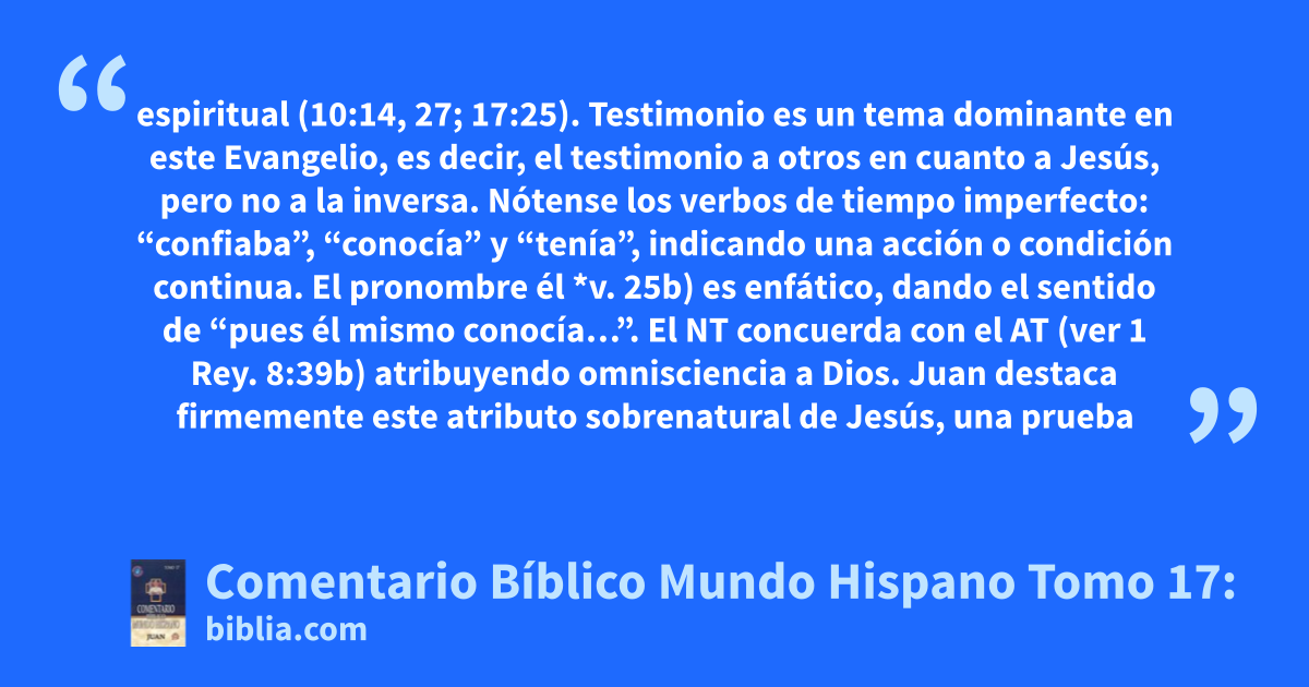 espiritual (10:14, 27; 17:25). Testimonio es un tema dominante en este Evangelio, es decir, el testimonio a otros en cuanto a Jesús, pero no a la inversa. Nótense los verbos de tiempo imperfecto: “confiaba”, “conocía” y “tenía”, indicando una acción o condición continua. El pronombre él *v. 25b) es enfático, dando el sentido de “pues él mismo conocía…”. El NT concuerda con el AT (ver 1 Rey. 8:39b) atribuyendo omnisciencia a Dios. Juan destaca firmemente este atributo sobrenatural de Jesús, una prueba