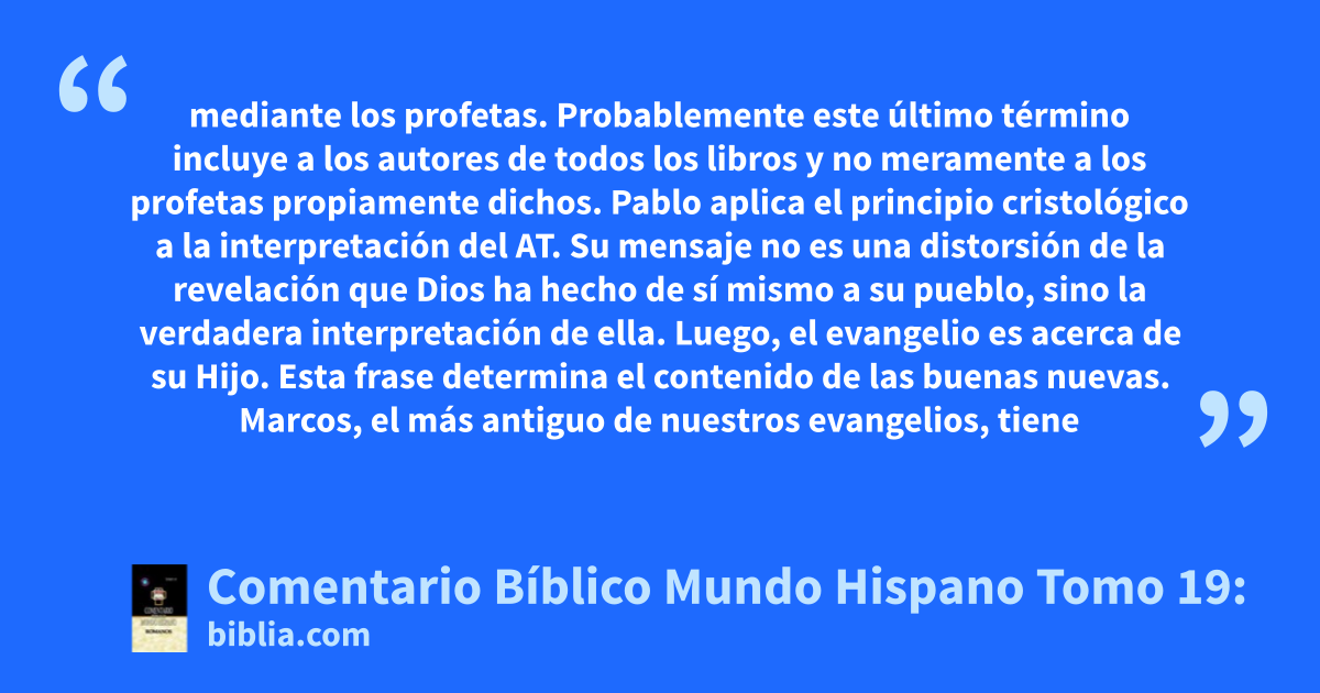 mediante los profetas. Probablemente este último término incluye a los autores de todos los libros y no meramente a los profetas propiamente dichos. Pablo aplica el principio cristológico a la interpretación del AT. Su mensaje no es una distorsión de la revelación que Dios ha hecho de sí mismo a su pueblo, sino la verdadera interpretación de ella. Luego, el evangelio es acerca de su Hijo. Esta frase determina el contenido de las buenas nuevas. Marcos, el más antiguo de nuestros evangelios, tiene