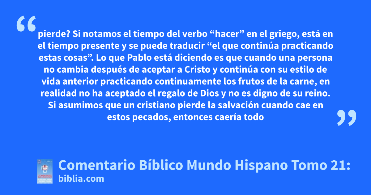 pierde? Si notamos el tiempo del verbo “hacer” en el griego, está en el tiempo presente y se puede traducir “el que continúa practicando estas cosas”. Lo que Pablo está diciendo es que cuando una persona no cambia después de aceptar a Cristo y continúa con su estilo de vida anterior practicando continuamente los frutos de la carne, en realidad no ha aceptado el regalo de Dios y no es digno de su reino. Si asumimos que un cristiano pierde la salvación cuando cae en estos pecados, entonces caería todo