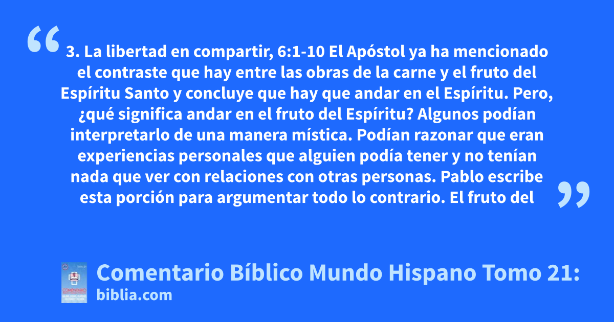 3. La libertad en compartir, 6:1-10 El Apóstol ya ha mencionado el contraste que hay entre las obras de la carne y el fruto del Espíritu Santo y concluye que hay que andar en el Espíritu. Pero, ¿qué significa andar en el fruto del Espíritu? Algunos podían interpretarlo de una manera mística. Podían razonar que eran experiencias personales que alguien podía tener y no tenían nada que ver con relaciones con otras personas. Pablo escribe esta porción para argumentar todo lo contrario. El fruto del