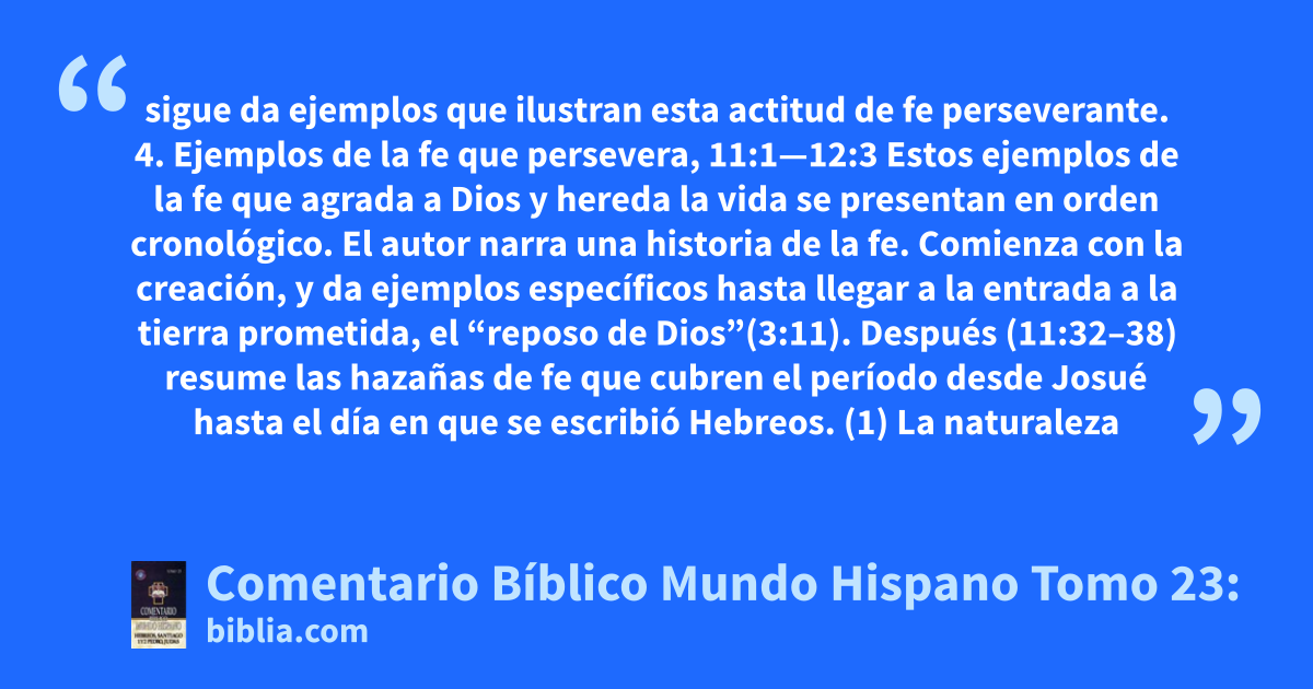 sigue da ejemplos que ilustran esta actitud de fe perseverante. 4. Ejemplos de la fe que persevera, 11:1—12:3 Estos ejemplos de la fe que agrada a Dios y hereda la vida se presentan en orden cronológico. El autor narra una historia de la fe. Comienza con la creación, y da ejemplos específicos hasta llegar a la entrada a la tierra prometida, el “reposo de Dios”(3:11). Después (11:32–38) resume las hazañas de fe que cubren el período desde Josué hasta el día en que se escribió Hebreos. (1) La naturaleza