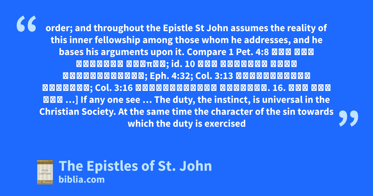 order; and throughout the Epistle St John assumes the reality of this inner fellowship among those whom he addresses, and he bases his arguments upon it. Compare 1 Pet. 4:8 τὴν εἰς ἑαυτοὺς ἀγάπην; id. 10 εἰς ἑαυτοὺς αὐτὸ διακονοῦντες; Eph. 4:32; Col. 3:13 χαριζόμενοι ἑαυτοῖς; Col. 3:16 νουθετοῦντες ἑαυτούς. 16. Ἐάν τις ἴδῃ …] If any one see … The duty, the instinct, is universal in the Christian Society. At the same time the character of the sin towards which the duty is exercised
