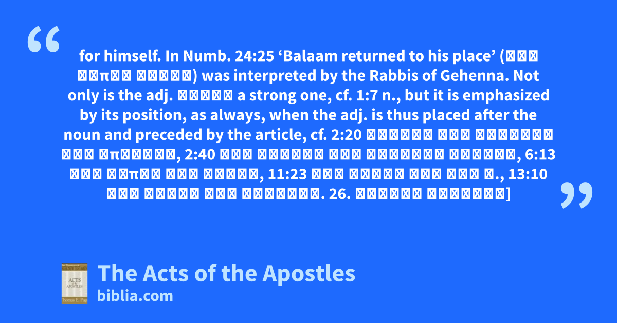 for himself. In Numb. 24:25 ‘Balaam returned to his place’ (τὸν τόπον αὐτοῦ) was interpreted by the Rabbis of Gehenna. Not only is the adj. ἴδιος a strong one, cf. 1:7 n., but it is emphasized by its position, as always, when the adj. is thus placed after the noun and preceded by the article, cf. 2:20 ἡμέραν τὴν μεγάλην καὶ ἐπιφανῆ, 2:40 τῆς γενεᾶς τῆς σκολιᾶς ταύτης, 6:13 τοῦ τόπου τοῦ ἁγίου, 11:23 τὴν χάριν τὴν τοῦ θ., 13:10 τὰς ὁδοὺς τὰς εὐθείας. 26. ἔδωκαν κλήρους]