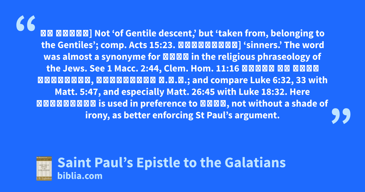 ἐξ ἐθνῶν] Not ‘of Gentile descent,’ but ‘taken from, belonging to the Gentiles’; comp. Acts 15:23. ἁμαρτωλοί] ‘sinners.’ The word was almost a synonyme for ἔθνη in the religious phraseology of the Jews. See 1 Macc. 2:44, Clem. Hom. 11:16 οὕτως ὡς οὐχὶ Ἰουδαῖος, ἁμαρτωλὸς κ.τ.λ.; and compare Luke 6:32, 33 with Matt. 5:47, and especially Matt. 26:45 with Luke 18:32. Here ἁμαρτωλοὶ is used in preference to ἔθνη, not without a shade of irony, as better enforcing St Paul’s argument.