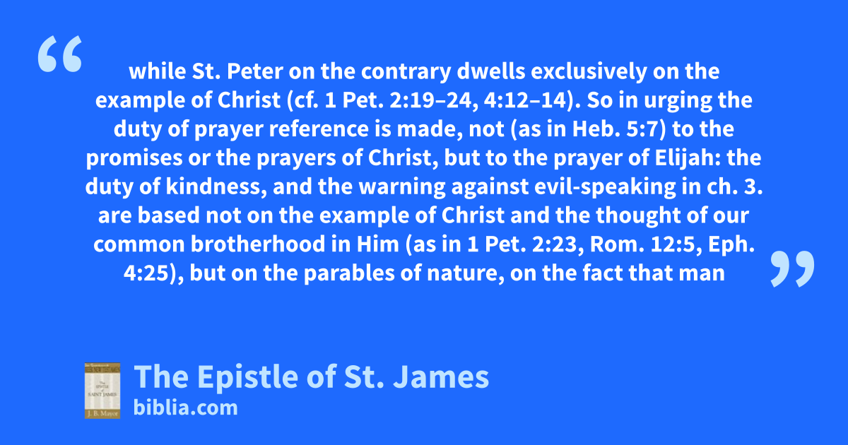 while St. Peter on the contrary dwells exclusively on the example of Christ (cf. 1 Pet. 2:19–24, 4:12–14). So in urging the duty of prayer reference is made, not (as in Heb. 5:7) to the promises or the prayers of Christ, but to the prayer of Elijah: the duty of kindness, and the warning against evil-speaking in ch. 3. are based not on the example of Christ and the thought of our common brotherhood in Him (as in 1 Pet. 2:23, Rom. 12:5, Eph. 4:25), but on the parables of nature, on the fact that man