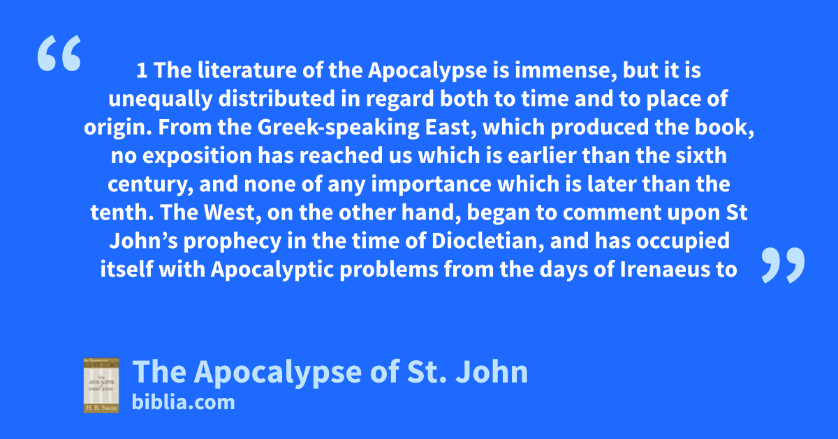 1 The literature of the Apocalypse is immense, but it is unequally distributed in regard both to time and to place of origin. From the Greek-speaking East, which produced the book, no exposition has reached us which is earlier than the sixth century, and none of any importance which is later than the tenth. The West, on the other hand, began to comment upon St John’s prophecy in the time of Diocletian, and has occupied itself with Apocalyptic problems from the days of Irenaeus to