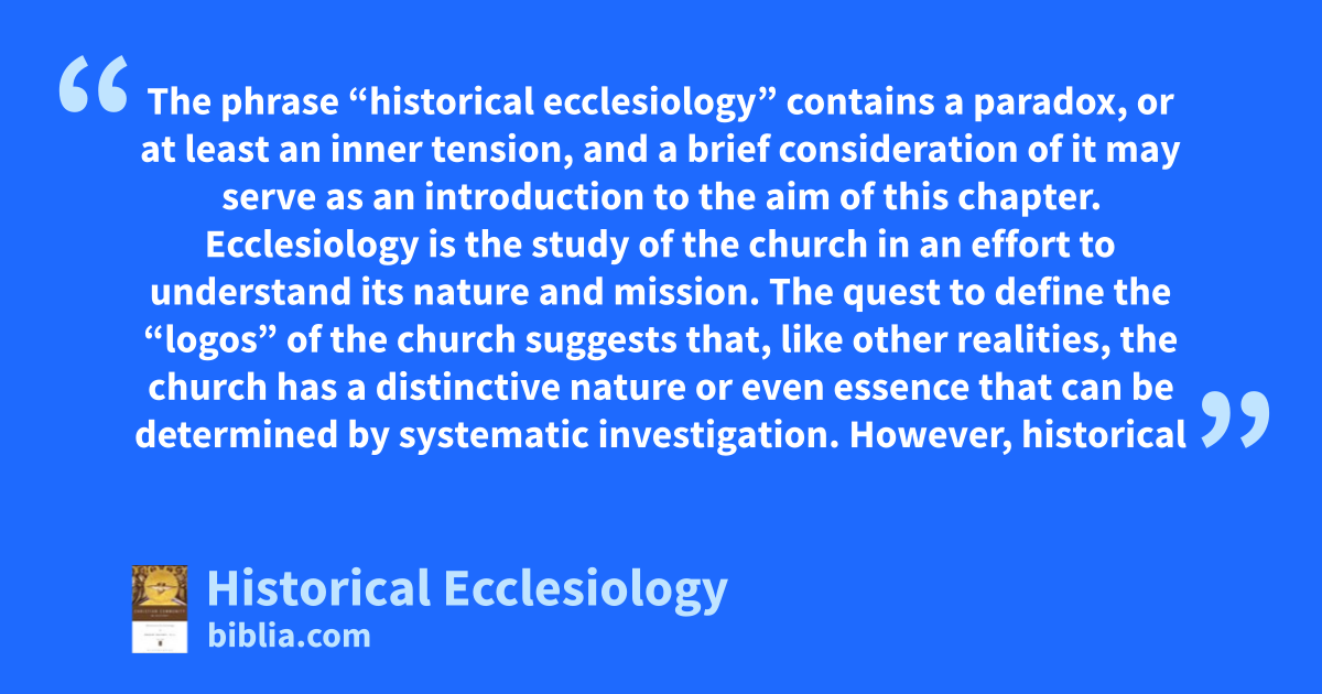 The phrase “historical ecclesiology” contains a paradox, or at least an inner tension, and a brief consideration of it may serve as an introduction to the aim of this chapter. Ecclesiology is the study of the church in an effort to understand its nature and mission. The quest to define the “logos” of the church suggests that, like other realities, the church has a distinctive nature or even essence that can be determined by systematic investigation. However, historical