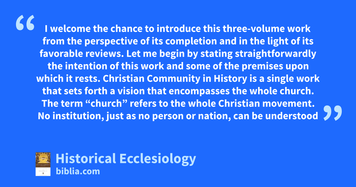 I welcome the chance to introduce this three-volume work from the perspective of its completion and in the light of its favorable reviews. Let me begin by stating straightforwardly the intention of this work and some of the premises upon which it rests. Christian Community in History is a single work that sets forth a vision that encompasses the whole church. The term “church” refers to the whole Christian movement. No institution, just as no person or nation, can be understood