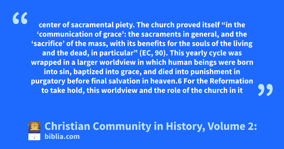 center of sacramental piety. The church proved itself “in the ‘communication of grace’: the sacraments in general, and the ‘sacrifice’ of the mass, with its benefits for the souls of the living and the dead, in particular” (EC, 90). This yearly cycle was wrapped in a larger worldview in which human beings were born into sin, baptized into grace, and died into punishment in purgatory before final salvation in heaven.6 For the Reformation to take hold, this worldview and the role of the church in it