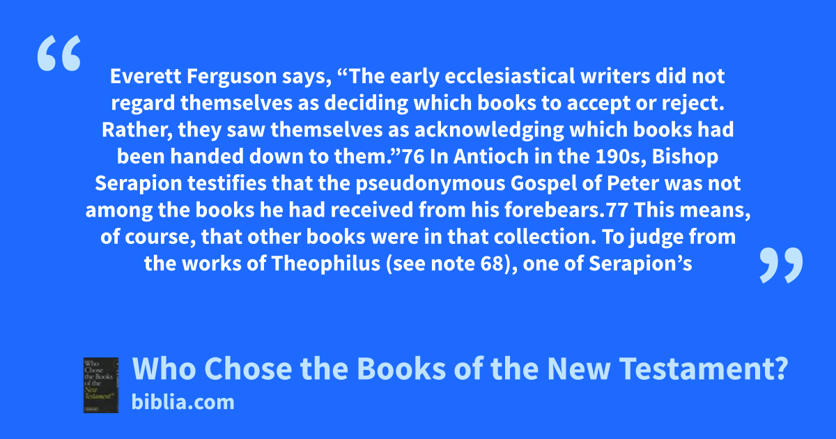 Everett Ferguson says, “The early ecclesiastical writers did not regard themselves as deciding which books to accept or reject. Rather, they saw themselves as acknowledging which books had been handed down to them.”76 In Antioch in the 190s, Bishop Serapion testifies that the pseudonymous Gospel of Peter was not among the books he had received from his forebears.77 This means, of course, that other books were in that collection. To judge from the works of Theophilus (see note 68), one of Serapion’s