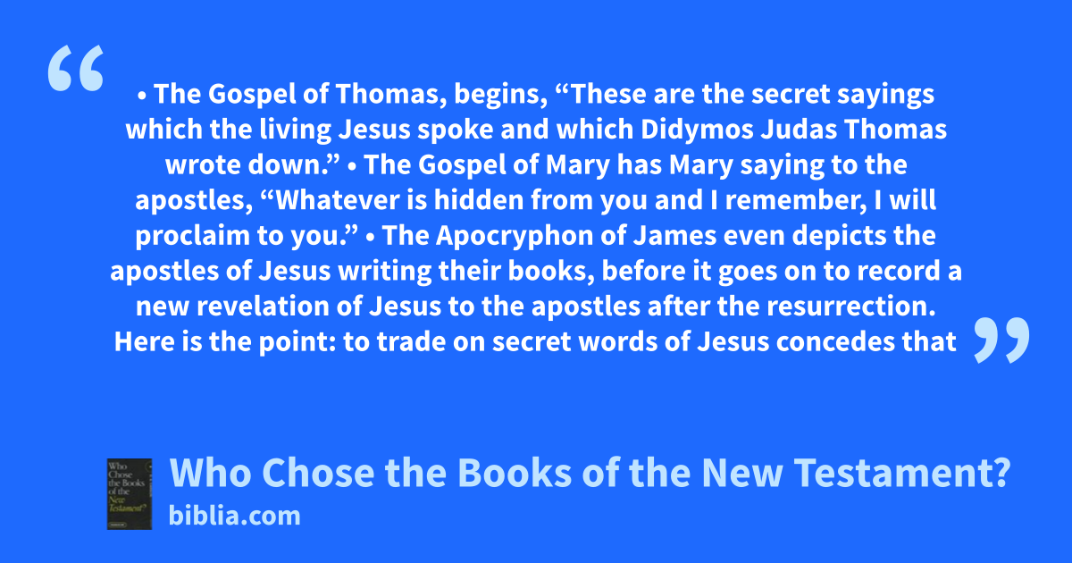 • The Gospel of Thomas, begins, “These are the secret sayings which the living Jesus spoke and which Didymos Judas Thomas wrote down.” • The Gospel of Mary has Mary saying to the apostles, “Whatever is hidden from you and I remember, I will proclaim to you.” • The Apocryphon of James even depicts the apostles of Jesus writing their books, before it goes on to record a new revelation of Jesus to the apostles after the resurrection. Here is the point: to trade on secret words of Jesus concedes that
