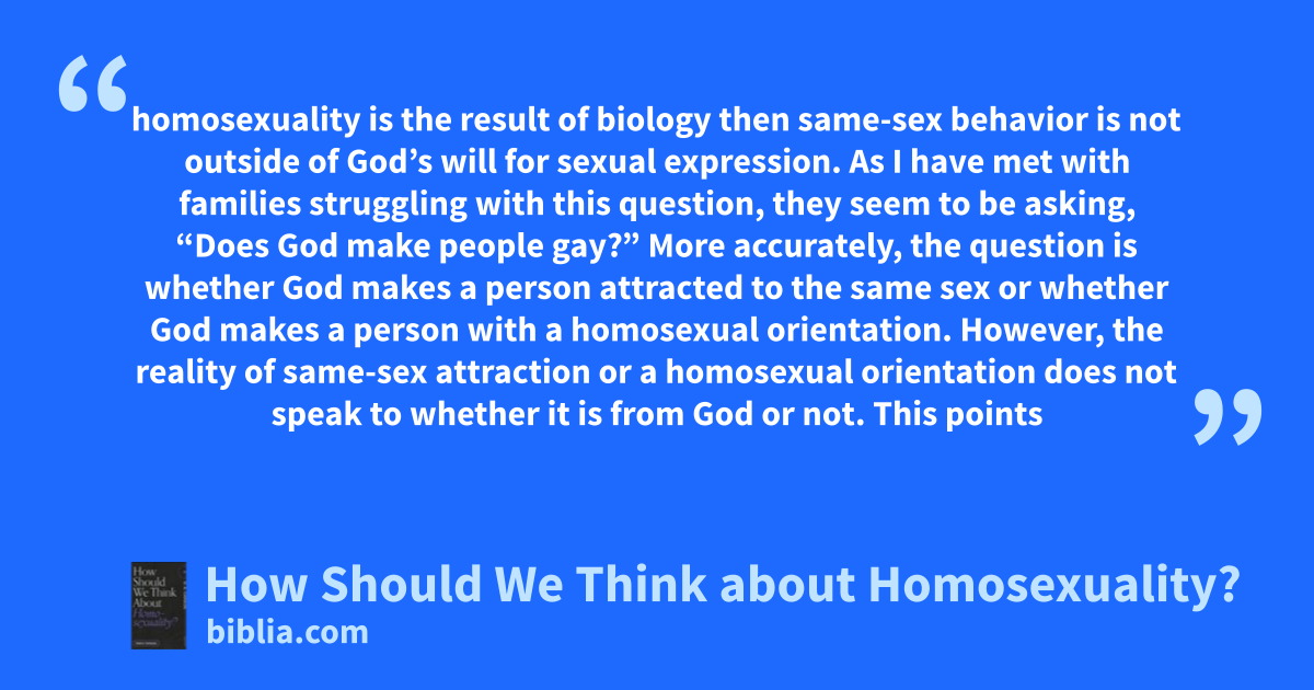 homosexuality is the result of biology then same-sex behavior is not outside of God’s will for sexual expression. As I have met with families struggling with this question, they seem to be asking, “Does God make people gay?” More accurately, the question is whether God makes a person attracted to the same sex or whether God makes a person with a homosexual orientation. However, the reality of same-sex attraction or a homosexual orientation does not speak to whether it is from God or not. This points