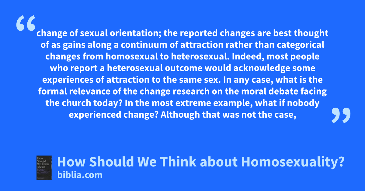 change of sexual orientation; the reported changes are best thought of as gains along a continuum of attraction rather than categorical changes from homosexual to heterosexual. Indeed, most people who report a heterosexual outcome would acknowledge some experiences of attraction to the same sex. In any case, what is the formal relevance of the change research on the moral debate facing the church today? In the most extreme example, what if nobody experienced change? Although that was not the case,