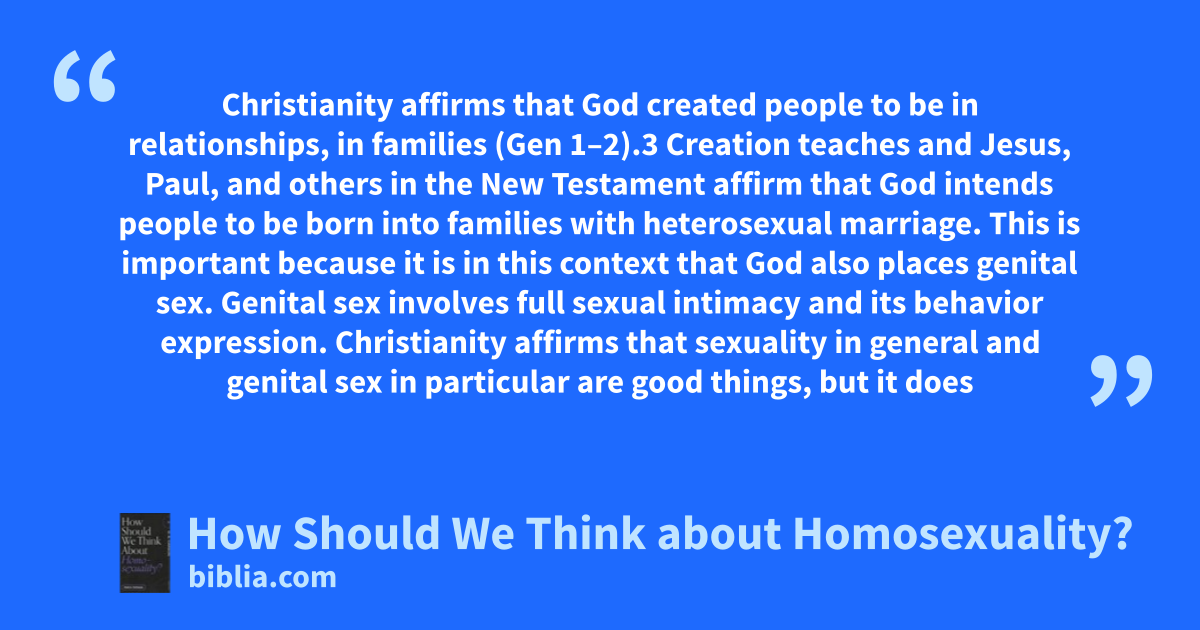Christianity affirms that God created people to be in relationships, in families (Gen 1–2).3 Creation teaches and Jesus, Paul, and others in the New Testament affirm that God intends people to be born into families with heterosexual marriage. This is important because it is in this context that God also places genital sex. Genital sex involves full sexual intimacy and its behavior expression. Christianity affirms that sexuality in general and genital sex in particular are good things, but it does