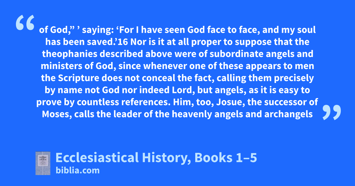of God,” ’ saying: ‘For I have seen God face to face, and my soul has been saved.’16 Nor is it at all proper to suppose that the theophanies described above were of subordinate angels and ministers of God, since whenever one of these appears to men the Scripture does not conceal the fact, calling them precisely by name not God nor indeed Lord, but angels, as it is easy to prove by countless references. Him, too, Josue, the successor of Moses, calls the leader of the heavenly angels and archangels