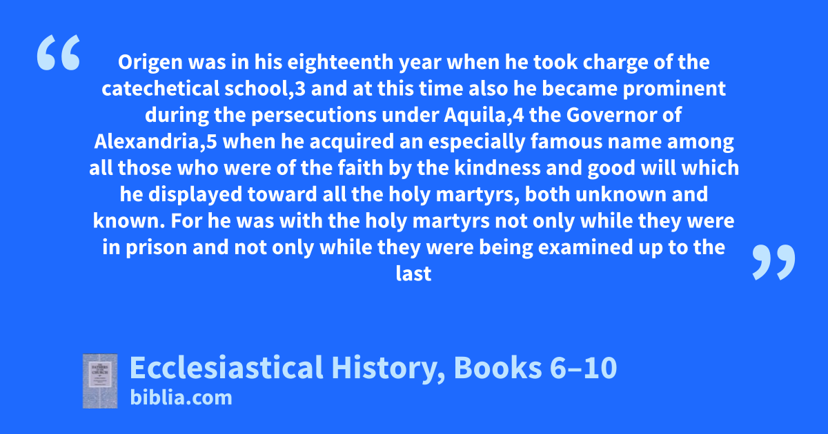 Origen was in his eighteenth year when he took charge of the catechetical school,3 and at this time also he became prominent during the persecutions under Aquila,4 the Governor of Alexandria,5 when he acquired an especially famous name among all those who were of the faith by the kindness and good will which he displayed toward all the holy martyrs, both unknown and known. For he was with the holy martyrs not only while they were in prison and not only while they were being examined up to the last