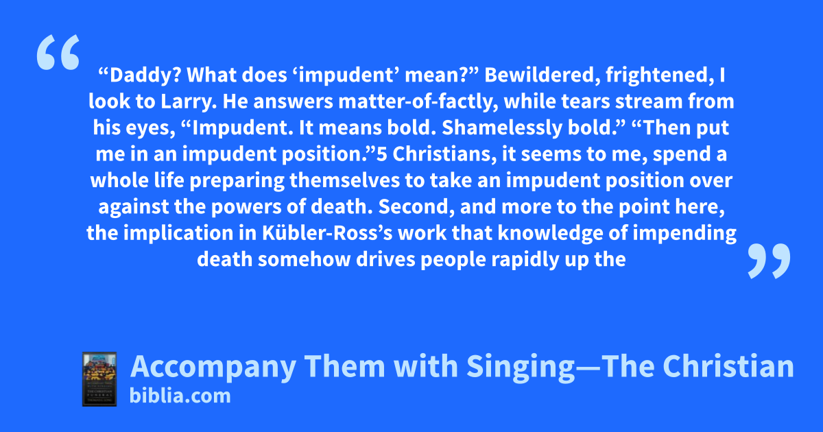 “Daddy? What does ‘impudent’ mean?” Bewildered, frightened, I look to Larry. He answers matter-of-factly, while tears stream from his eyes, “Impudent. It means bold. Shamelessly bold.” “Then put me in an impudent position.”5 Christians, it seems to me, spend a whole life preparing themselves to take an impudent position over against the powers of death. Second, and more to the point here, the implication in Kübler-Ross’s work that knowledge of impending death somehow drives people rapidly up the