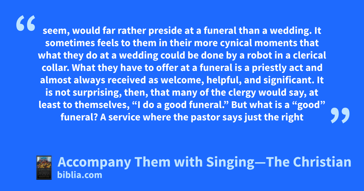 seem, would far rather preside at a funeral than a wedding. It sometimes feels to them in their more cynical moments that what they do at a wedding could be done by a robot in a clerical collar. What they have to offer at a funeral is a priestly act and almost always received as welcome, helpful, and significant. It is not surprising, then, that many of the clergy would say, at least to themselves, “I do a good funeral.” But what is a “good” funeral? A service where the pastor says just the right