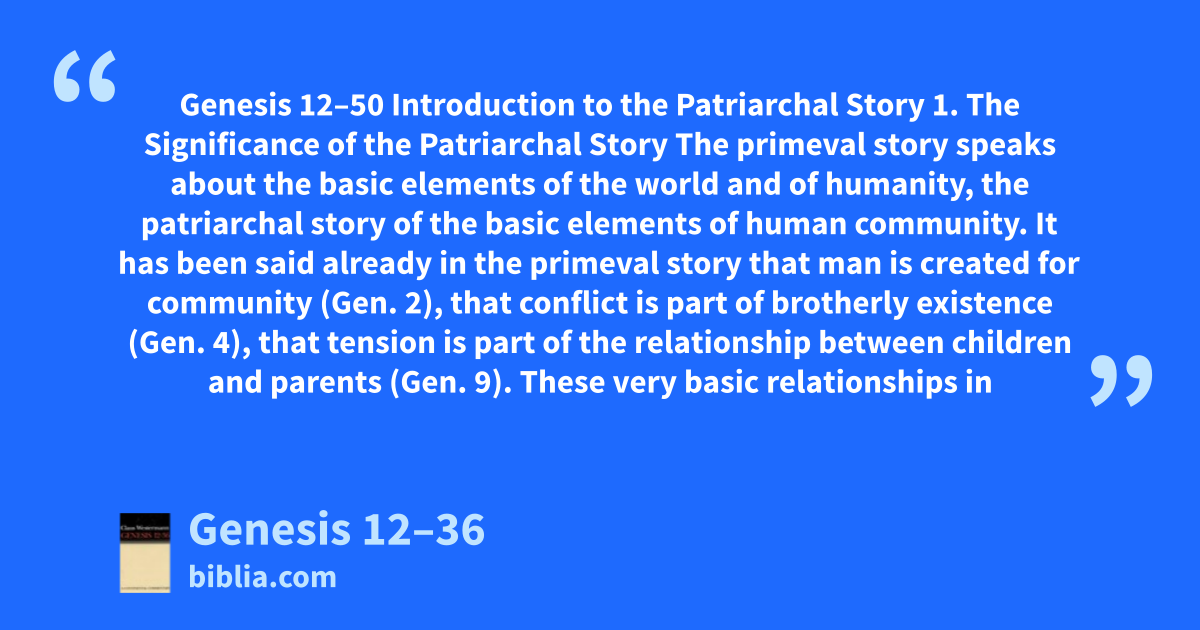 Genesis 12–50 Introduction to the Patriarchal Story 1. The Significance of the Patriarchal Story The primeval story speaks about the basic elements of the world and of humanity, the patriarchal story of the basic elements of human community. It has been said already in the primeval story that man is created for community (Gen. 2), that conflict is part of brotherly existence (Gen. 4), that tension is part of the relationship between children and parents (Gen. 9). These very basic relationships in
