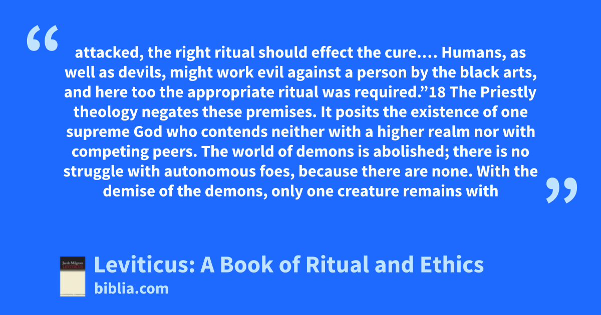 attacked, the right ritual should effect the cure.… Humans, as well as devils, might work evil against a person by the black arts, and here too the appropriate ritual was required.”18 The Priestly theology negates these premises. It posits the existence of one supreme God who contends neither with a higher realm nor with competing peers. The world of demons is abolished; there is no struggle with autonomous foes, because there are none. With the demise of the demons, only one creature remains with
