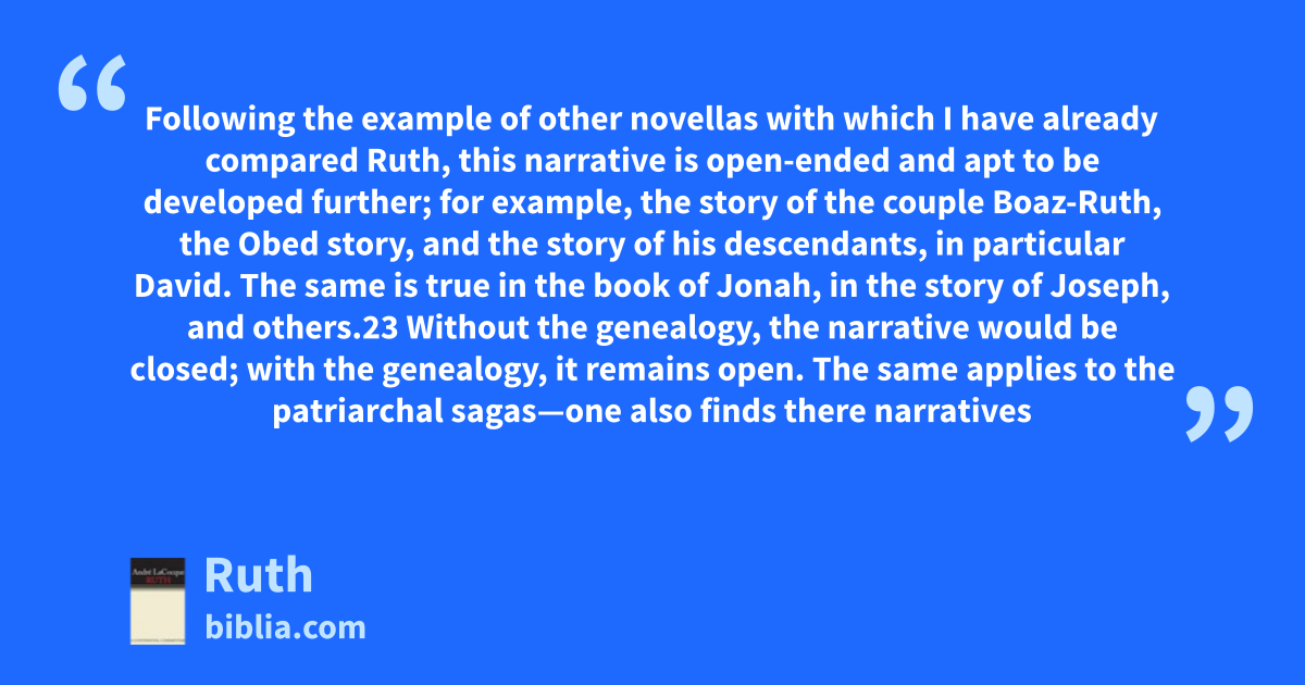 Following the example of other novellas with which I have already compared Ruth, this narrative is open-ended and apt to be developed further; for example, the story of the couple Boaz-Ruth, the Obed story, and the story of his descendants, in particular David. The same is true in the book of Jonah, in the story of Joseph, and others.23 Without the genealogy, the narrative would be closed; with the genealogy, it remains open. The same applies to the patriarchal sagas—one also finds there narratives