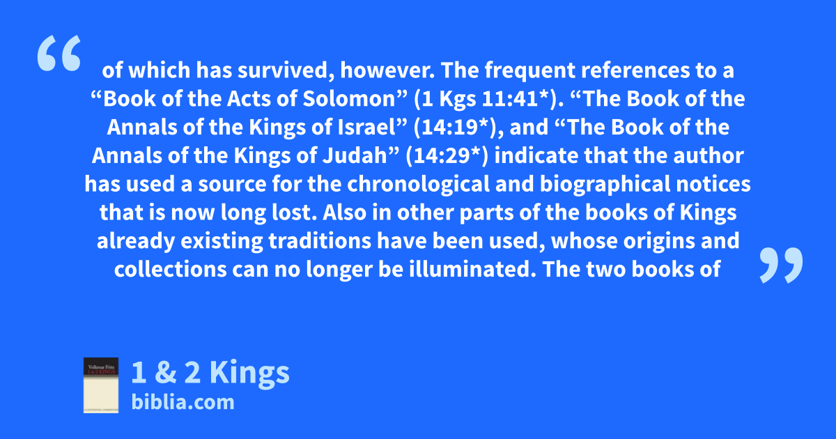 of which has survived, however. The frequent references to a “Book of the Acts of Solomon” (1 Kgs 11:41*). “The Book of the Annals of the Kings of Israel” (14:19*), and “The Book of the Annals of the Kings of Judah” (14:29*) indicate that the author has used a source for the chronological and biographical notices that is now long lost. Also in other parts of the books of Kings already existing traditions have been used, whose origins and collections can no longer be illuminated. The two books of