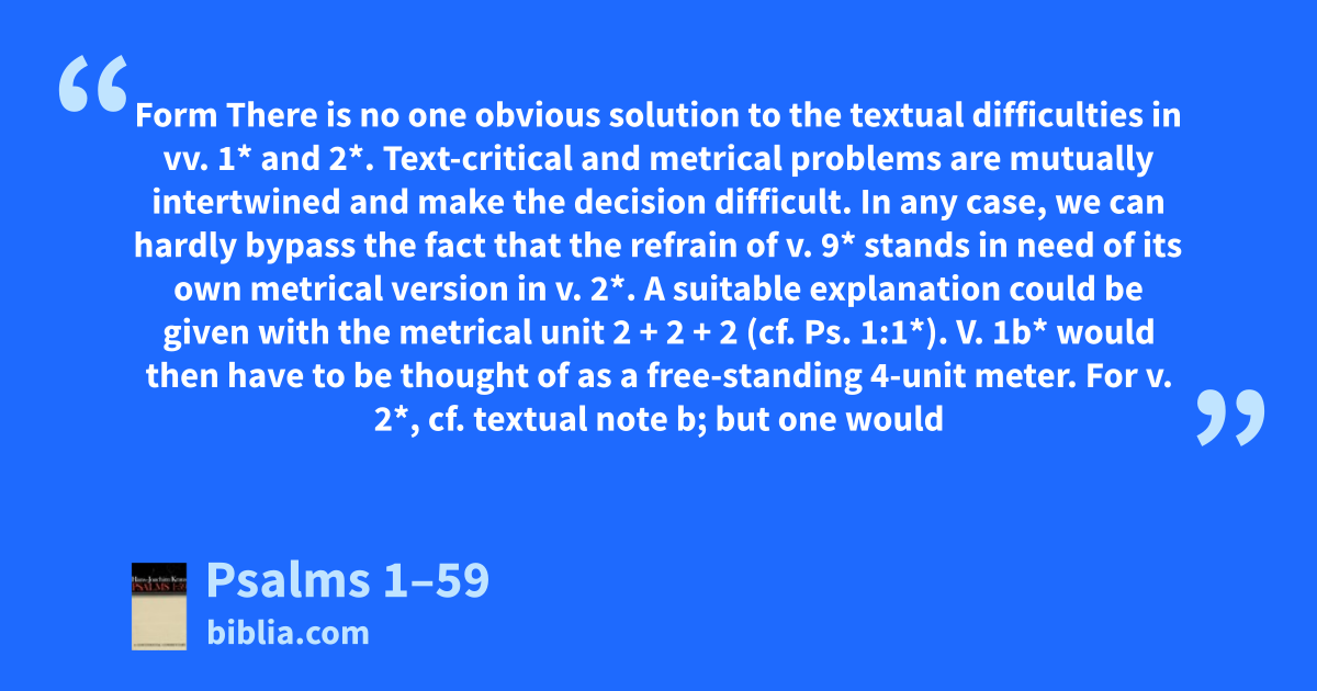 Form There is no one obvious solution to the textual difficulties in vv. 1* and 2*. Text-critical and metrical problems are mutually intertwined and make the decision difficult. In any case, we can hardly bypass the fact that the refrain of v. 9* stands in need of its own metrical version in v. 2*. A suitable explanation could be given with the metrical unit 2 + 2 + 2 (cf. Ps. 1:1*). V. 1b* would then have to be thought of as a free-standing 4-unit meter. For v. 2*, cf. textual note b; but one would