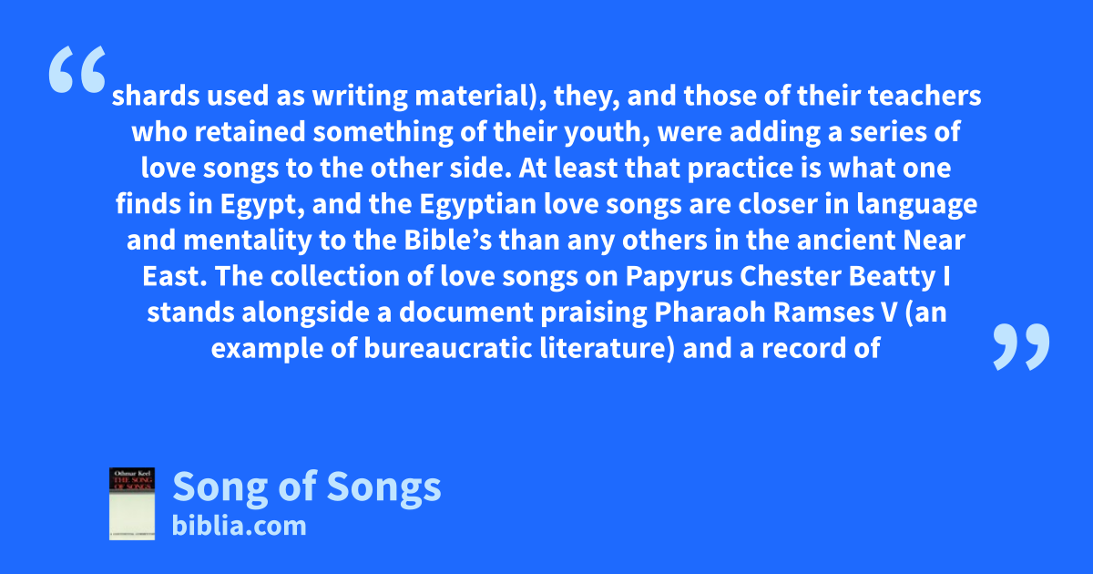 shards used as writing material), they, and those of their teachers who retained something of their youth, were adding a series of love songs to the other side. At least that practice is what one finds in Egypt, and the Egyptian love songs are closer in language and mentality to the Bible’s than any others in the ancient Near East. The collection of love songs on Papyrus Chester Beatty I stands alongside a document praising Pharaoh Ramses V (an example of bureaucratic literature) and a record of