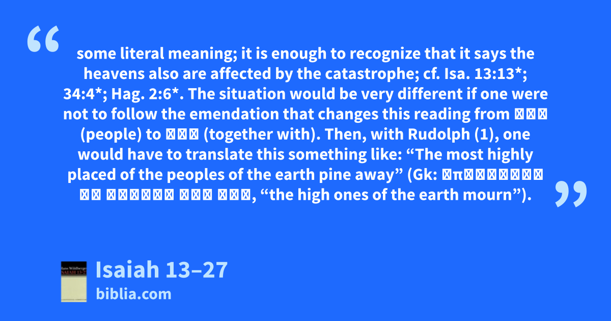 some literal meaning; it is enough to recognize that it says the heavens also are affected by the catastrophe; cf. Isa. 13:13*; 34:4*; Hag. 2:6*. The situation would be very different if one were not to follow the emendation that changes this reading from עַם (people) to עִם (together with). Then, with Rudolph (1), one would have to translate this something like: “The most highly placed of the peoples of the earth pine away” (Gk: ἐπένθησαν οἱ ὑψηλοὶ τῆς γῆς, “the high ones of the earth mourn”).