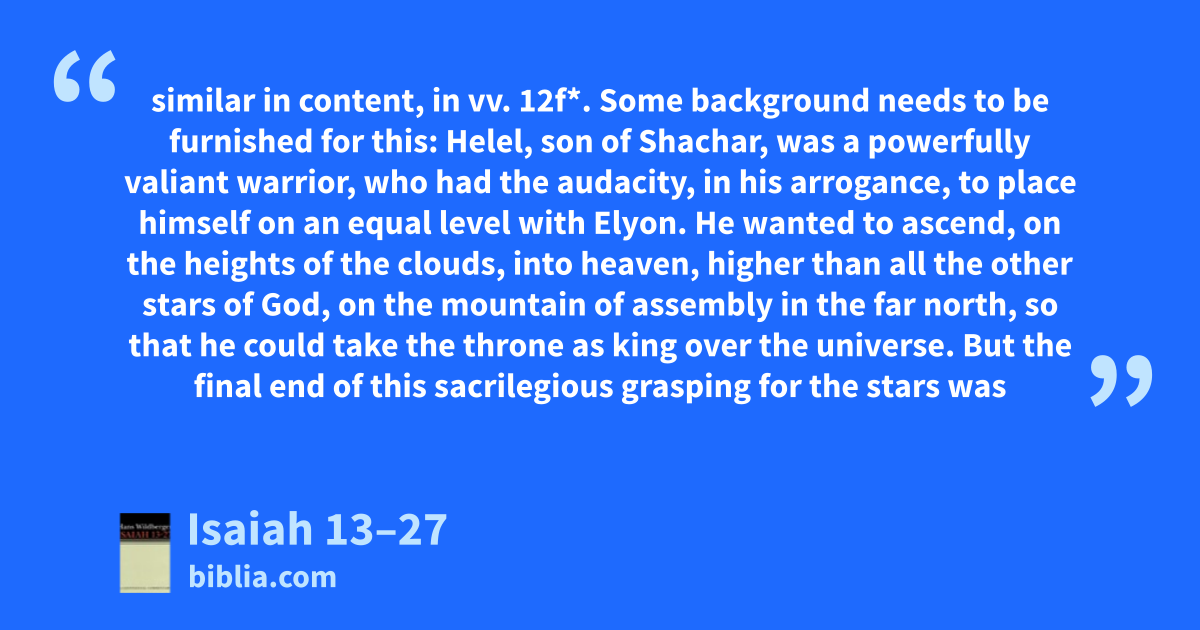 similar in content, in vv. 12f*. Some background needs to be furnished for this: Helel, son of Shachar, was a powerfully valiant warrior, who had the audacity, in his arrogance, to place himself on an equal level with Elyon. He wanted to ascend, on the heights of the clouds, into heaven, higher than all the other stars of God, on the mountain of assembly in the far north, so that he could take the throne as king over the universe. But the final end of this sacrilegious grasping for the stars was