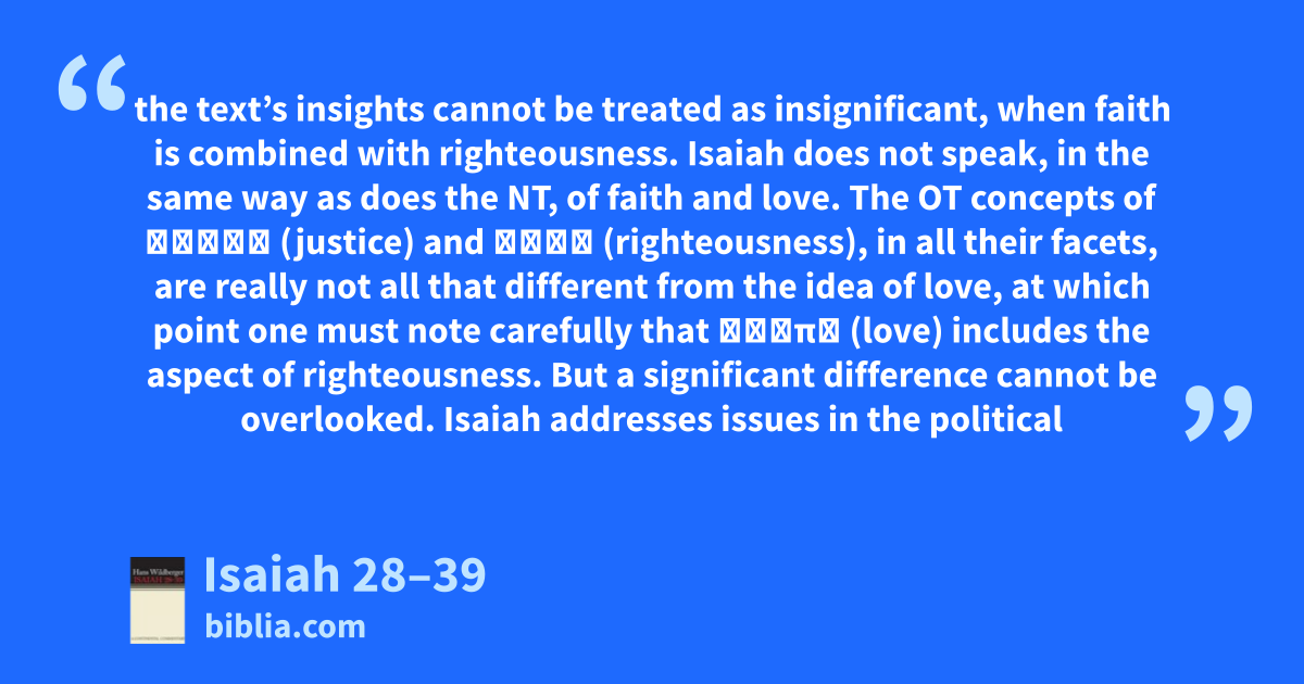 the text’s insights cannot be treated as insignificant, when faith is combined with righteousness. Isaiah does not speak, in the same way as does the NT, of faith and love. The OT concepts of משׁפט (justice) and צדקה (righteousness), in all their facets, are really not all that different from the idea of love, at which point one must note carefully that ἀγάπη (love) includes the aspect of righteousness. But a significant difference cannot be overlooked. Isaiah addresses issues in the political