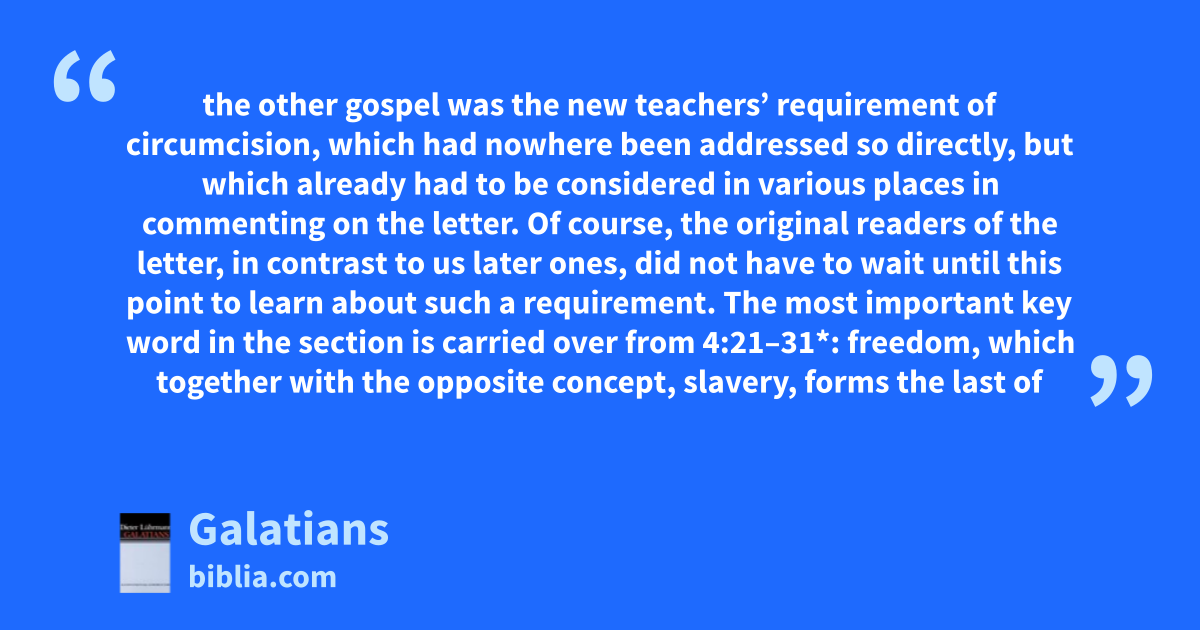 the other gospel was the new teachers’ requirement of circumcision, which had nowhere been addressed so directly, but which already had to be considered in various places in commenting on the letter. Of course, the original readers of the letter, in contrast to us later ones, did not have to wait until this point to learn about such a requirement. The most important key word in the section is carried over from 4:21–31*: freedom, which together with the opposite concept, slavery, forms the last of