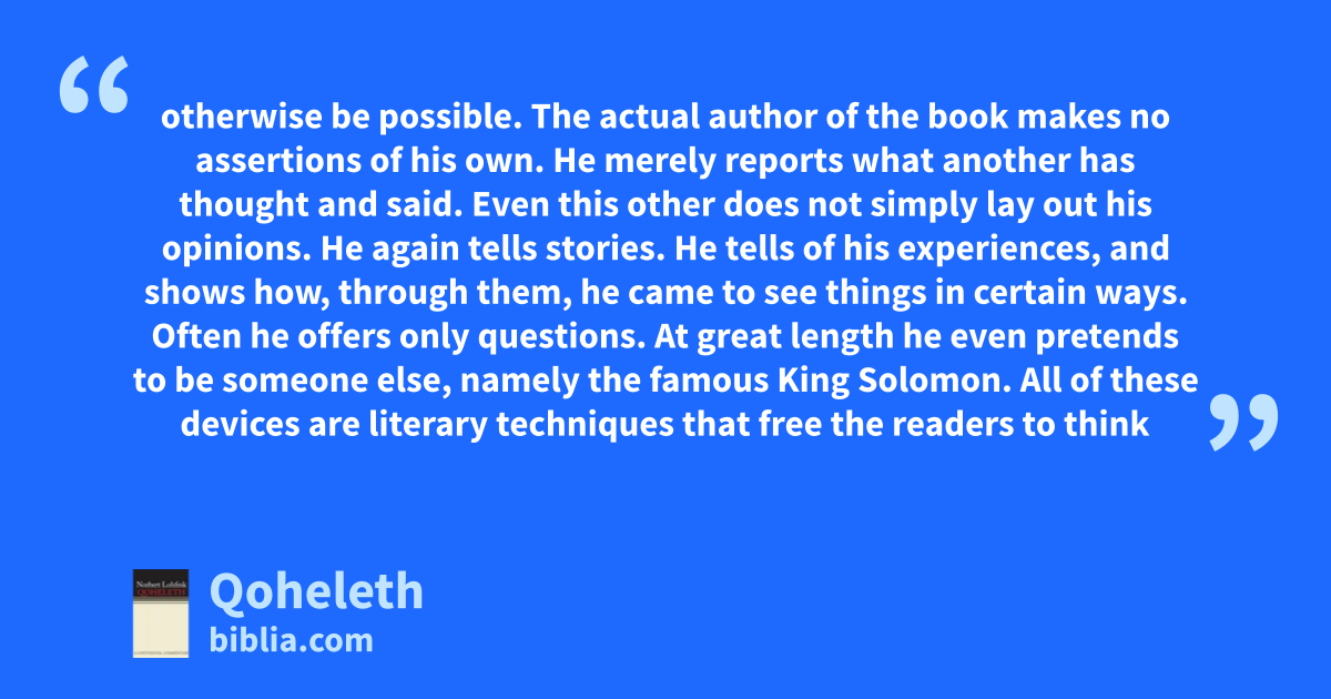 otherwise be possible. The actual author of the book makes no assertions of his own. He merely reports what another has thought and said. Even this other does not simply lay out his opinions. He again tells stories. He tells of his experiences, and shows how, through them, he came to see things in certain ways. Often he offers only questions. At great length he even pretends to be someone else, namely the famous King Solomon. All of these devices are literary techniques that free the readers to think
