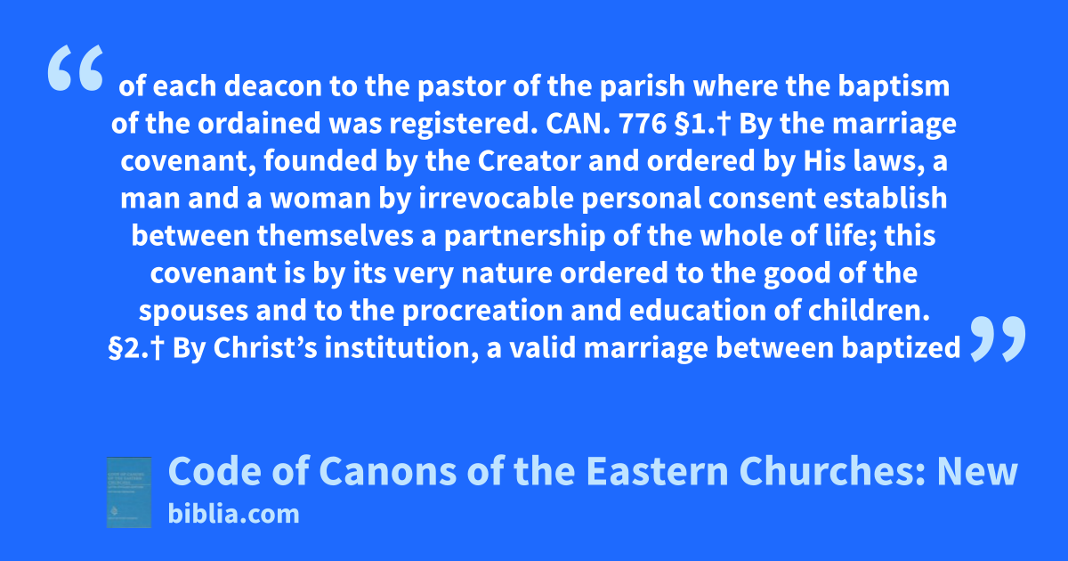 of each deacon to the pastor of the parish where the baptism of the ordained was registered. CAN. 776 §1.† By the marriage covenant, founded by the Creator and ordered by His laws, a man and a woman by irrevocable personal consent establish between themselves a partnership of the whole of life; this covenant is by its very nature ordered to the good of the spouses and to the procreation and education of children. §2.† By Christ’s institution, a valid marriage between baptized