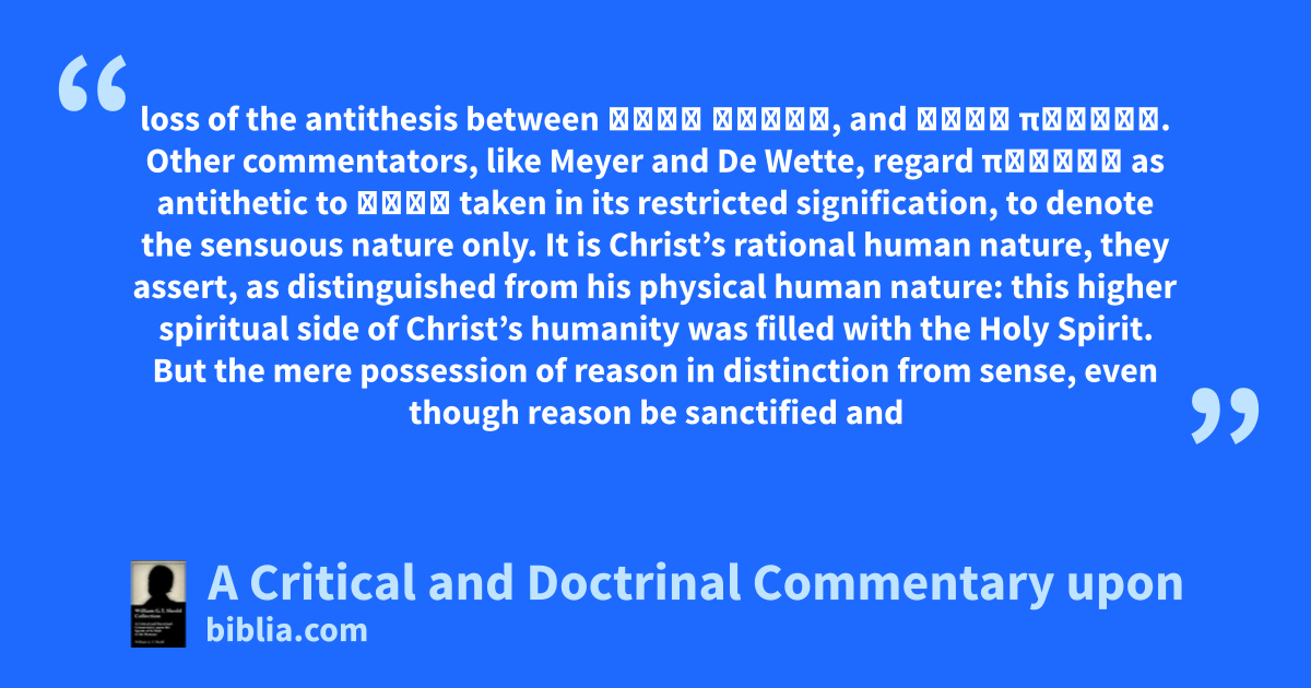 loss of the antithesis between κατὰ σάρκα, and κατὰ πνεῦμα. Other commentators, like Meyer and De Wette, regard πνεῦμα as antithetic to σάρξ taken in its restricted signification, to denote the sensuous nature only. It is Christ’s rational human nature, they assert, as distinguished from his physical human nature: this higher spiritual side of Christ’s humanity was filled with the Holy Spirit. But the mere possession of reason in distinction from sense, even though reason be sanctified and