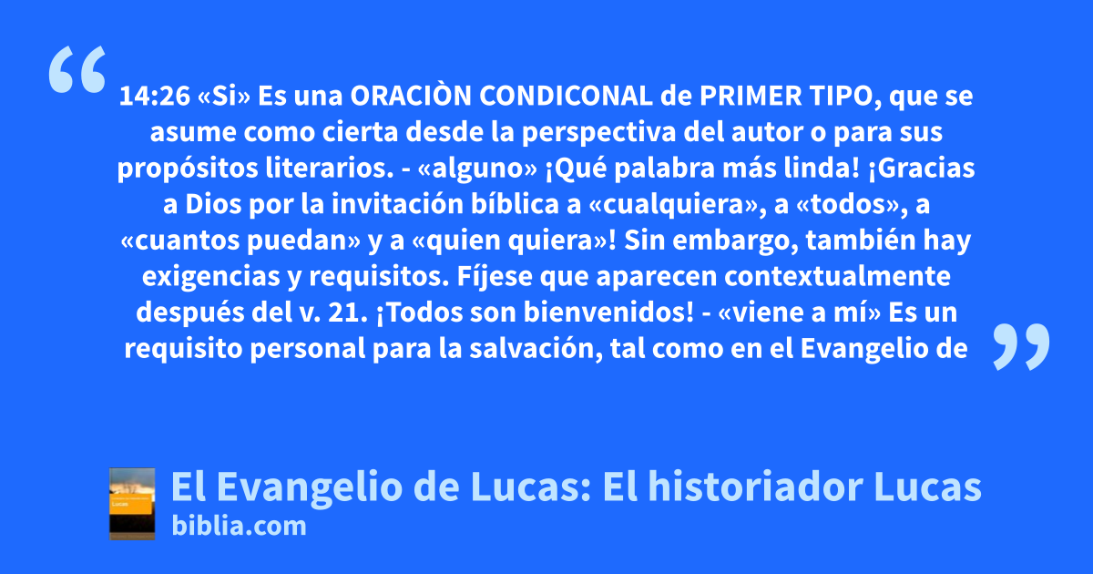 14:26 «Si» Es una ORACIÒN CONDICONAL de PRIMER TIPO, que se asume como cierta desde la perspectiva del autor o para sus propósitos literarios. - «alguno» ¡Qué palabra más linda! ¡Gracias a Dios por la invitación bíblica a «cualquiera», a «todos», a «cuantos puedan» y a «quien quiera»! Sin embargo, también hay exigencias y requisitos. Fíjese que aparecen contextualmente después del v. 21. ¡Todos son bienvenidos! - «viene a mí» Es un requisito personal para la salvación, tal como en el Evangelio de