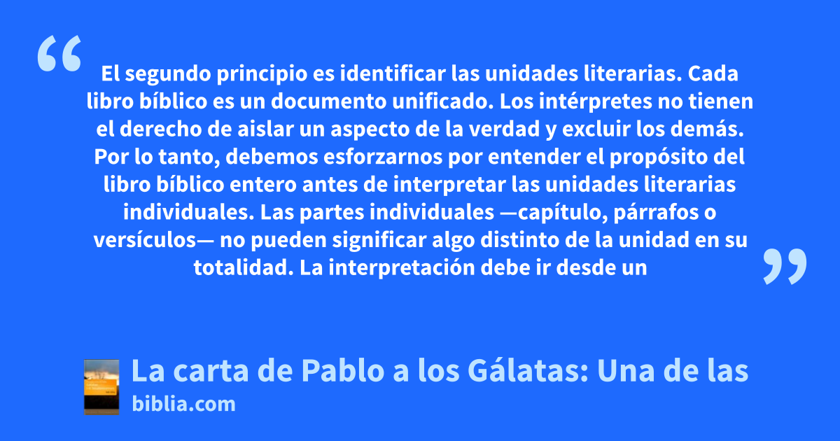 El segundo principio es identificar las unidades literarias. Cada libro bíblico es un documento unificado. Los intérpretes no tienen el derecho de aislar un aspecto de la verdad y excluir los demás. Por lo tanto, debemos esforzarnos por entender el propósito del libro bíblico entero antes de interpretar las unidades literarias individuales. Las partes individuales —capítulo, párrafos o versículos— no pueden significar algo distinto de la unidad en su totalidad. La interpretación debe ir desde un