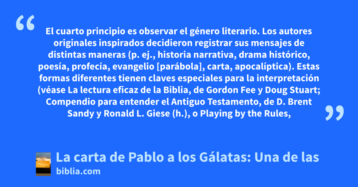 El cuarto principio es observar el género literario. Los autores originales inspirados decidieron registrar sus mensajes de distintas maneras (p. ej., historia narrativa, drama histórico, poesía, profecía, evangelio [parábola], carta, apocalíptica). Estas formas diferentes tienen claves especiales para la interpretación (véase La lectura eficaz de la Biblia, de Gordon Fee y Doug Stuart; Compendio para entender el Antiguo Testamento, de D. Brent Sandy y Ronald L. Giese (h.), o Playing by the Rules,