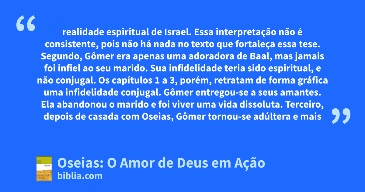 realidade espiritual de Israel. Essa interpretação não é consistente, pois não há nada no texto que fortaleça essa tese. Segundo, Gômer era apenas uma adoradora de Baal, mas jamais foi infiel ao seu marido. Sua infidelidade teria sido espiritual, e não conjugal. Os capítulos 1 a 3, porém, retratam de forma gráfica uma infidelidade conjugal. Gômer entregou-se a seus amantes. Ela abandonou o marido e foi viver uma vida dissoluta. Terceiro, depois de casada com Oseias, Gômer tornou-se adúltera e mais