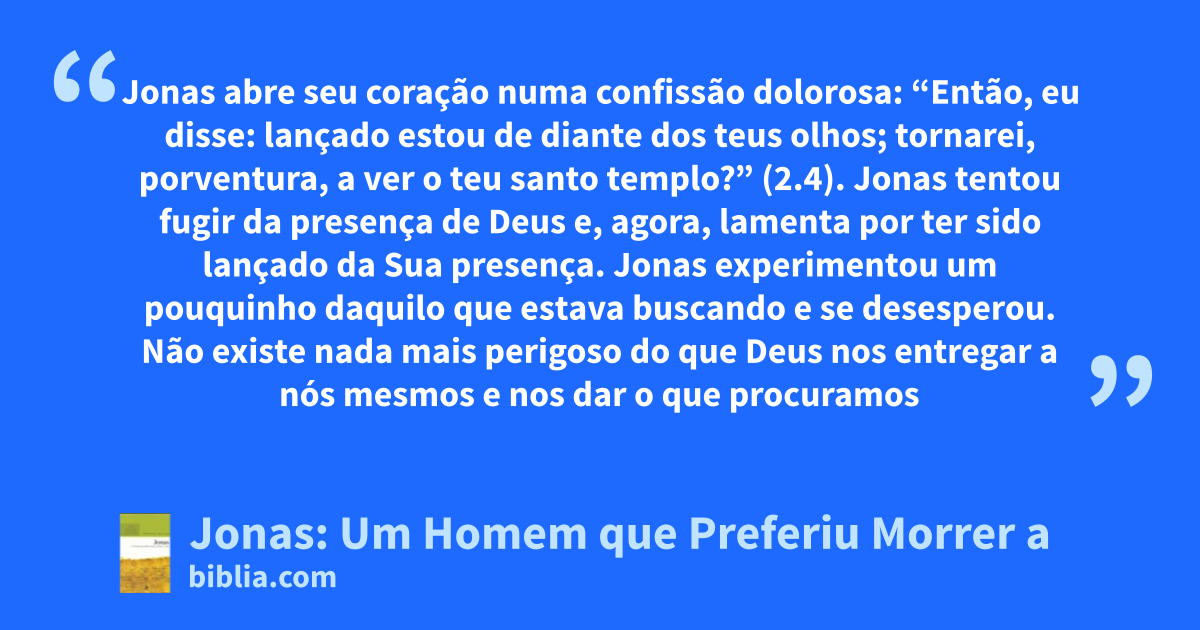 Jonas abre seu coração numa confissão dolorosa: “Então, eu disse: lançado estou de diante dos teus olhos; tornarei, porventura, a ver o teu santo templo?” (2.4). Jonas tentou fugir da presença de Deus e, agora, lamenta por ter sido lançado da Sua presença. Jonas experimentou um pouquinho daquilo que estava buscando e se desesperou. Não existe nada mais perigoso do que Deus nos entregar a nós mesmos e nos dar o que procuramos