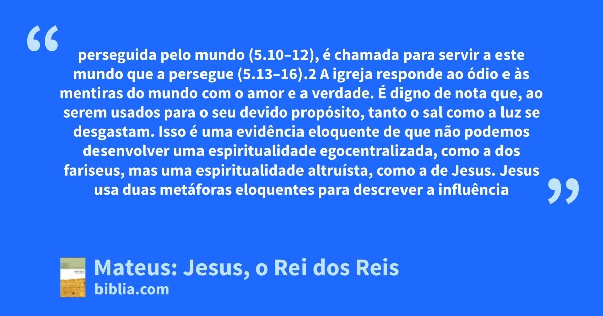 perseguida pelo mundo (5.10–12), é chamada para servir a este mundo que a persegue (5.13–16).2 A igreja responde ao ódio e às mentiras do mundo com o amor e a verdade. É digno de nota que, ao serem usados para o seu devido propósito, tanto o sal como a luz se desgastam. Isso é uma evidência eloquente de que não podemos desenvolver uma espiritualidade egocentralizada, como a dos fariseus, mas uma espiritualidade altruísta, como a de Jesus. Jesus usa duas metáforas eloquentes para descrever a influência