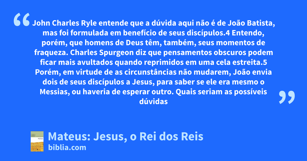 John Charles Ryle entende que a dúvida aqui não é de João Batista, mas foi formulada em benefício de seus discípulos.4 Entendo, porém, que homens de Deus têm, também, seus momentos de fraqueza. Charles Spurgeon diz que pensamentos obscuros podem ficar mais avultados quando reprimidos em uma cela estreita.5 Porém, em virtude de as circunstâncias não mudarem, João envia dois de seus discípulos a Jesus, para saber se ele era mesmo o Messias, ou haveria de esperar outro. Quais seriam as possíveis dúvidas