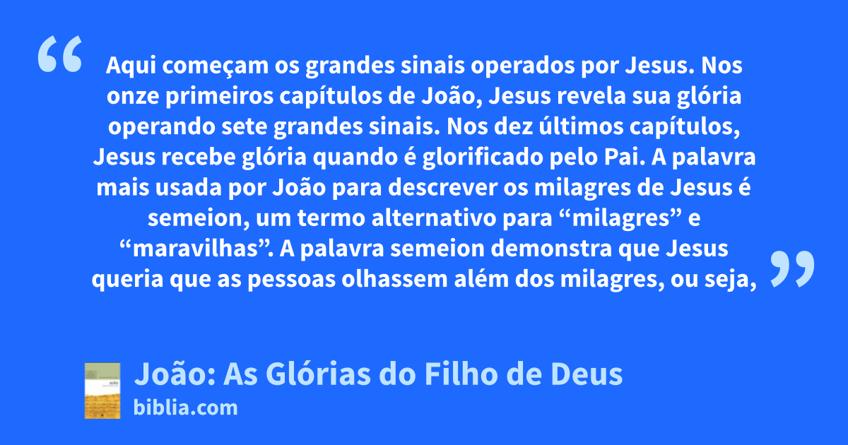 O evangelho de João é um reservatório inesgotável de onde jorra abundantemente o conhecimento de Jesus. Foi escrito para conhecer aquele que se apresentou como o pão da vida; a luz do mundo; a porta; o bom pastor; o caminho, e a verdade, e a vida; a ressurreição e a vida; e, a videira verdadeira. Aqui, sete milagres são registrados para confirmar a divindade de Jesus Cristo. Ele transformou água...