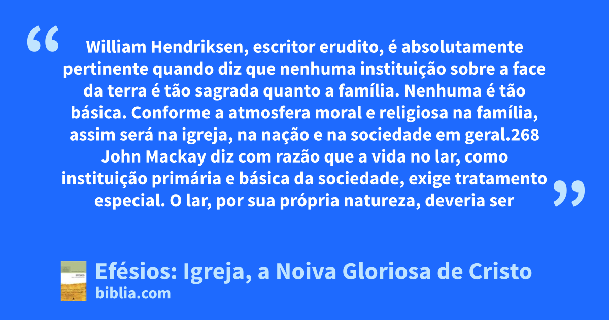 William Hendriksen, escritor erudito, é absolutamente pertinente quando diz que nenhuma instituição sobre a face da terra é tão sagrada quanto a família. Nenhuma é tão básica. Conforme a atmosfera moral e religiosa na família, assim será na igreja, na nação e na sociedade em geral.268 John Mackay diz com razão que a vida no lar, como instituição primária e básica da sociedade, exige tratamento especial. O lar, por sua própria natureza, deveria ser