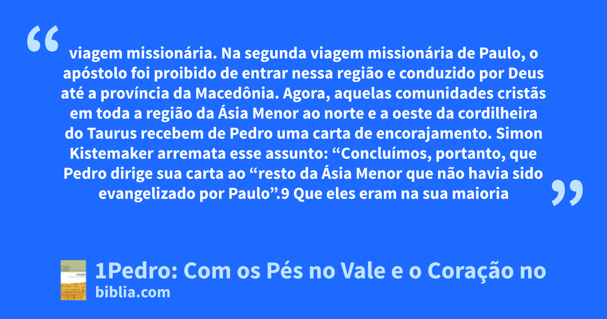 viagem missionária. Na segunda viagem missionária de Paulo, o apóstolo foi proibido de entrar nessa região e conduzido por Deus até a província da Macedônia. Agora, aquelas comunidades cristãs em toda a região da Ásia Menor ao norte e a oeste da cordilheira do Taurus recebem de Pedro uma carta de encorajamento. Simon Kistemaker arremata esse assunto: “Concluímos, portanto, que Pedro dirige sua carta ao “resto da Ásia Menor que não havia sido evangelizado por Paulo”.9 Que eles eram na sua maioria